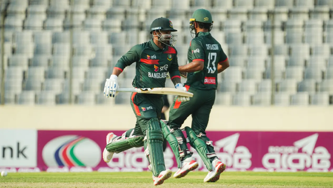 জবাব দিতে নেমে শুরুতেই তানজিদ হাসান তামিমকে হারিয়ে ফেলে বাংলাদেশ। দলীয় ২১ রানে তামিমের সাথে নাজমুল হোসেন শান্তকেও হারায় টাইগাররা। এরপর প্রতিরোধ গড়ে তোলেন সাইফ হাসান ও লিটন দাস।