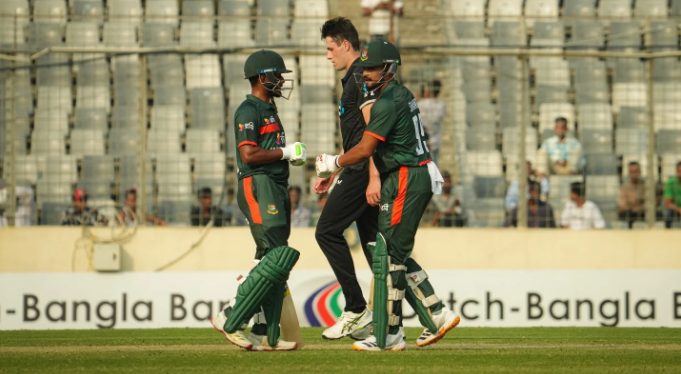 অধিনায়ক মেহেদি হাসান মিরাজ (৮) ও তাওহিদ হৃদয় (৩০) দলকে জয়ের বন্দরে পৌঁছে দিয়ে তবেই মাঠ ছাড়েন। ষষ্ঠ উইকেটে ৩২ রানের হার না মানা পার্টনারশিপ গড়ে দুজন।