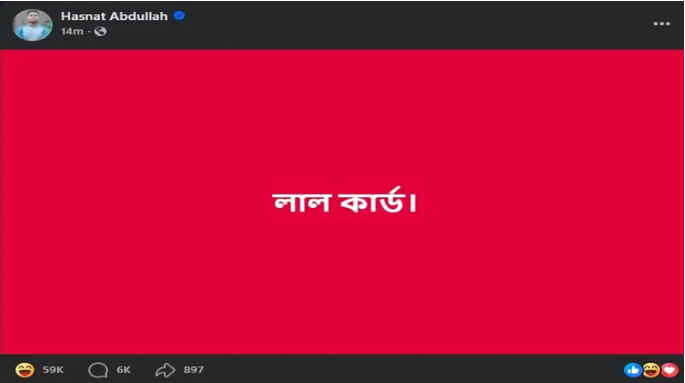 হাসনাত আবদুল্লাহ পোস্টে লেখেন, লাল কার্ড।